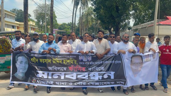 ধামরাই (ঢাকা), ২৫ সেপ্টেম্বর ২০২৫ইং (দৈনিক দেশপ্রেম রিপোর্ট): ঢাকা জেলা স্বেচ্ছাসেবক দলের অন্যতম সদস্য ও সাবেক ছাত্রনেতা ফয়সাল উদ্দিন হাশমি হত্যার বিচার দাবিতে মানববন্ধন ও বিক্ষোভ করেছে ধামরাই থানা ও পৌর স্বেচ্ছাসেবক দলের নেতা কর্মীরা। আজ বৃহস্পতিবার (২৫ সেপ্টেম্বর) দুপুরে ধামরাই উপজেলা চত্ত্বরে দলীয় নেতাকর্মীরা এ মানববন্ধন করেন। পুলিশের বিস্তারিত পড়ুন