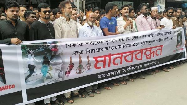২৯ জুন ২০১৯ইং (দেশপ্রেম রিপোর্ট): বরগুনায় রিফাত হত্যায় অপরাধীদের গ্রেফতার ও দৃষ্টান্তমূলক শাস্তির দাবিতে শনিবার জেলা প্রেসক্লাব চত্বরে সকাল ১০টার দিকে ‘বরগুনার সর্বস্তরের জনগণ’ এর ব্যানারে মানববন্ধন করেছেন এলাকাবাসী। মানববন্ধন ও প্রতিবাদ সমাবেশে বক্তব্য দেন নিহত রিফাত শরীফের বাবা দুলাল শরীফ, জেলা যুবলীগের সভাপতি অ্যাডভোকেট কামরুল আহসান মহারাজ, জেলা আওয়ামী বিস্তারিত পড়ুন